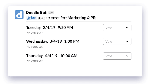 Integrate internal communications tools your employees already use on a daily basis, like Slack, into your scheduling software. For example, your employees can add the Doodle Bot on Slack so they never have to leave Slack to schedule their next meeting. How convenient and efficient is that? Very. Plus, it will keep them accountable and on-time to the meetings they’ve scheduled.